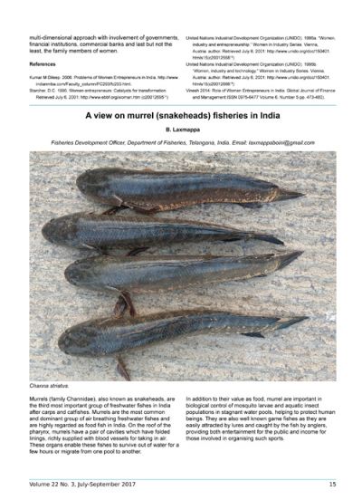 Murrels(家庭Channidae),也被称为蛇头,是鲤鱼和鲶鱼后,在印度河鲜的第三个最重要的群体。Murrels是最常见和空气呼吸淡水鱼的主要群体,并高度重视在印度食用鱼。上咽的屋顶,murrels具有一对已折叠的衬片,具有丰富的血管供给用于使空气腔。这些器官启用这些鱼的水中几个小时或迁移,从一个水池到另一个生存了。